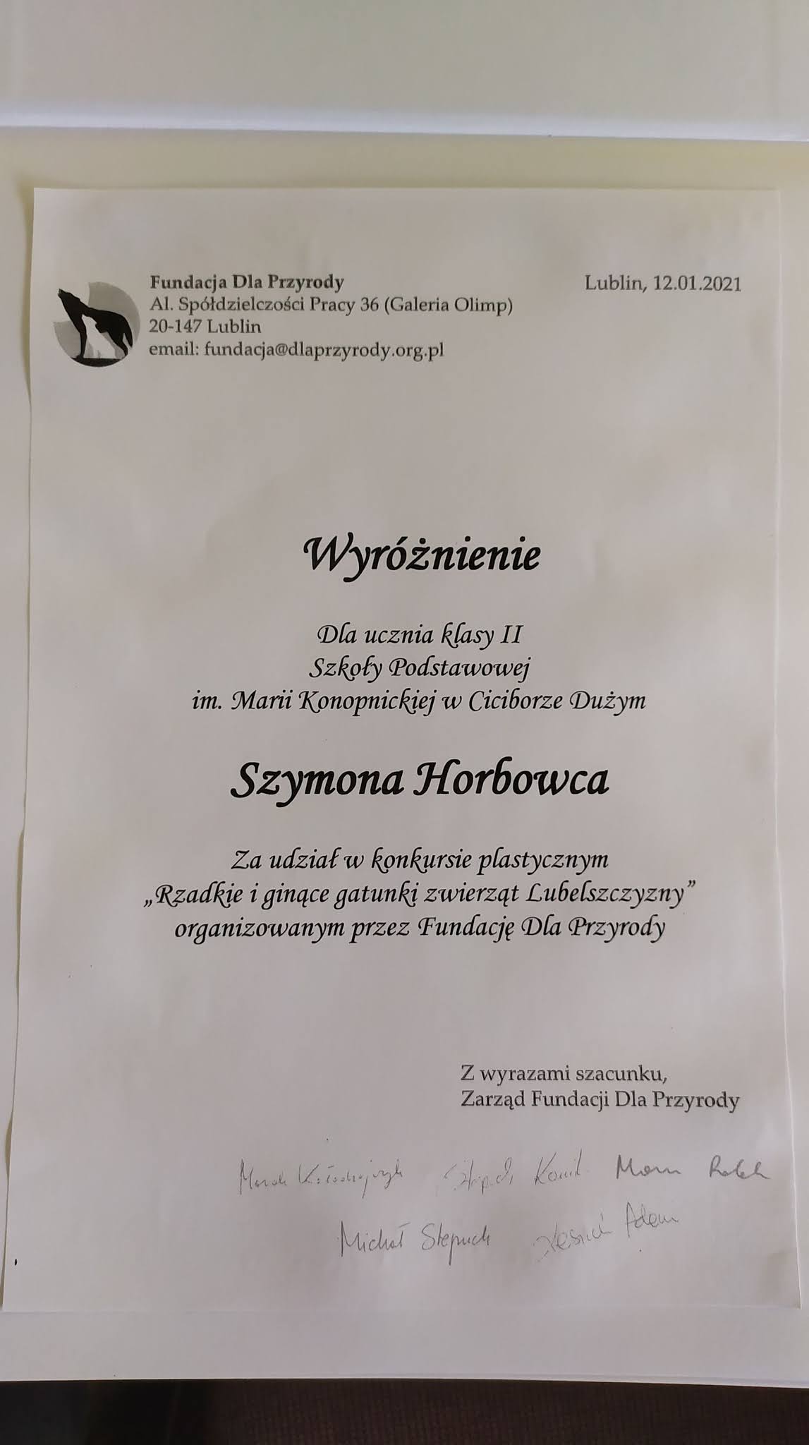 Uczeń klasy II został wyróżniony w konkursie plastycznym "Rzadkie i ginące gatunki zwierząt zwierząt Lubelszczyzny" organizowany przez Fundację dla Przyrody. Gratulujemy!!!